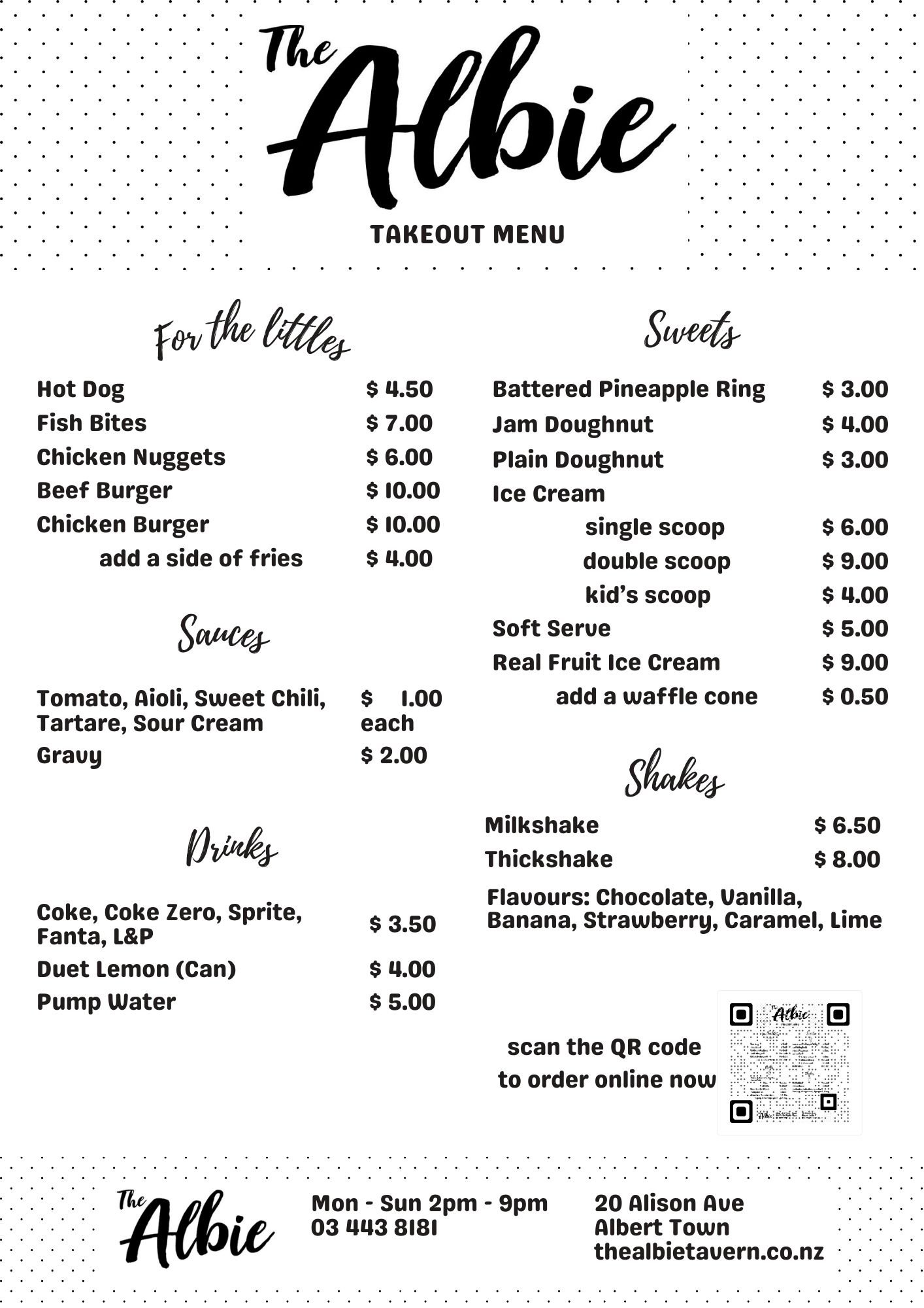 Take a taste of The Albie home with our convenient takeaway menu. Whether you’re craving classic fish & chips, famous Blue Cod, or a homemade pizza - we have it for you. Fast, fresh, and perfect for nights in.